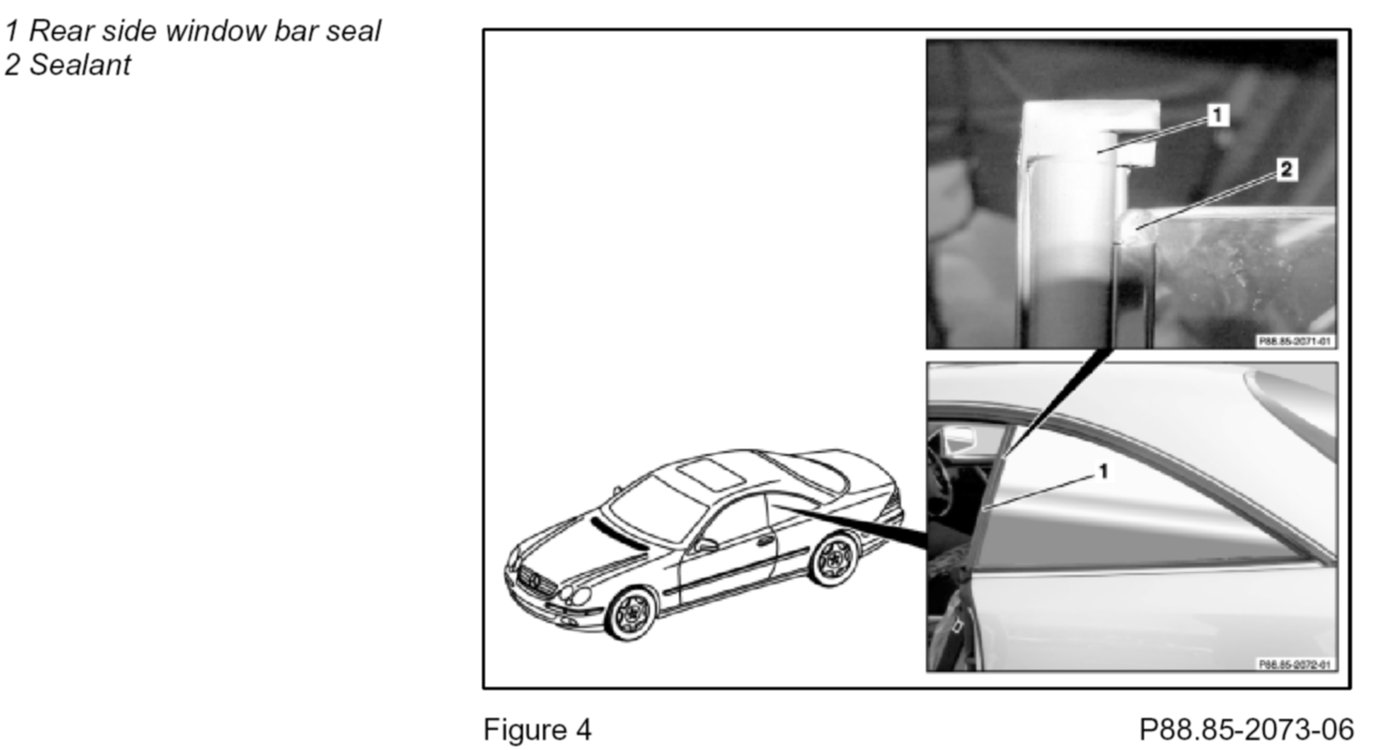 3. At the rear side window bar seal towards the driver's door window (3-Figure 1)