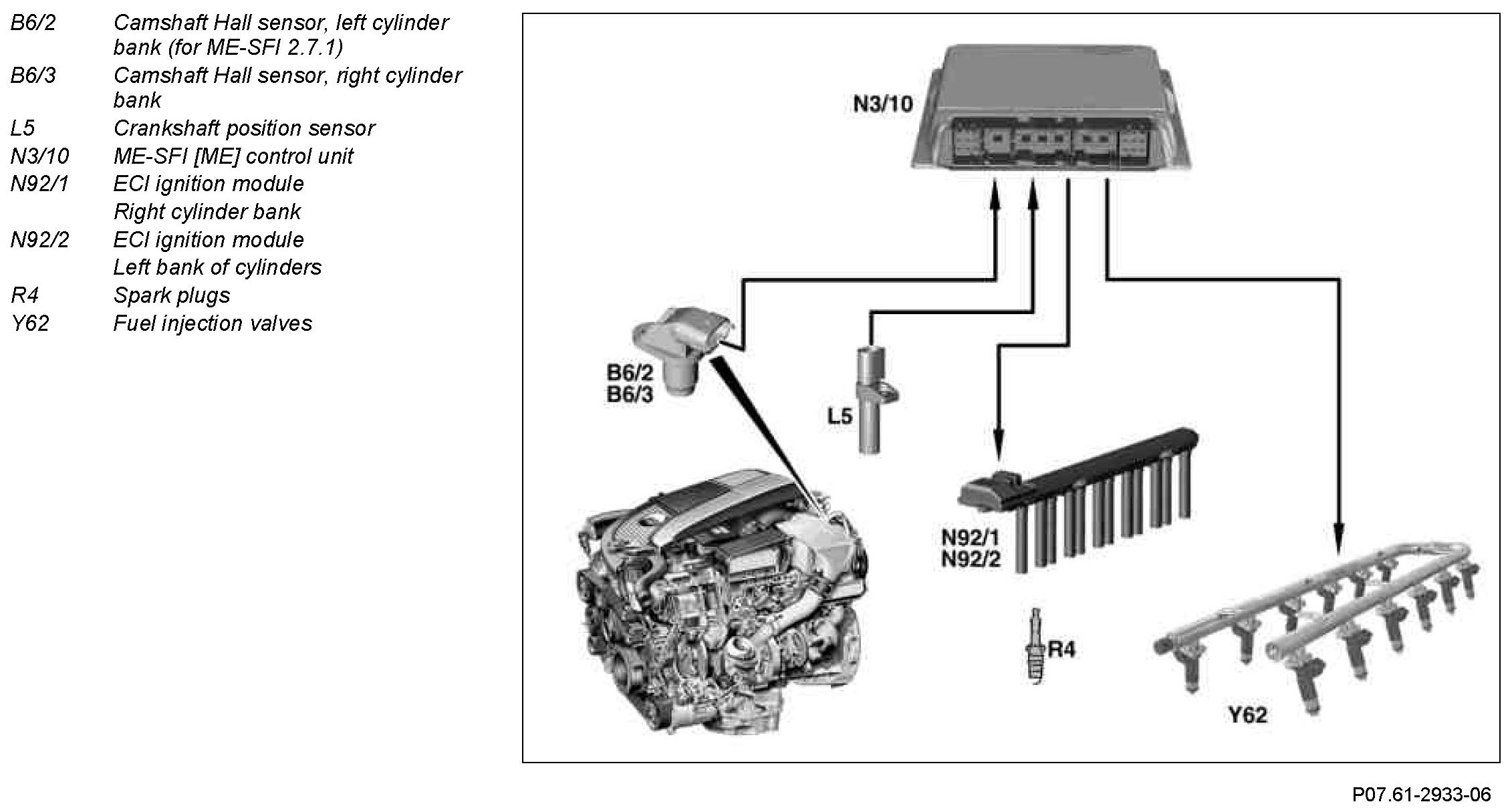 Synchronization of the injection and firing order is further processed by the ME-SFI [ME] control unit for determination of the ignition timing and actuation of the Fuel injection valves. In addition, it is required for the anti-knock control, the ion current evaluation and for the fuel shutoff at individual cylinders.