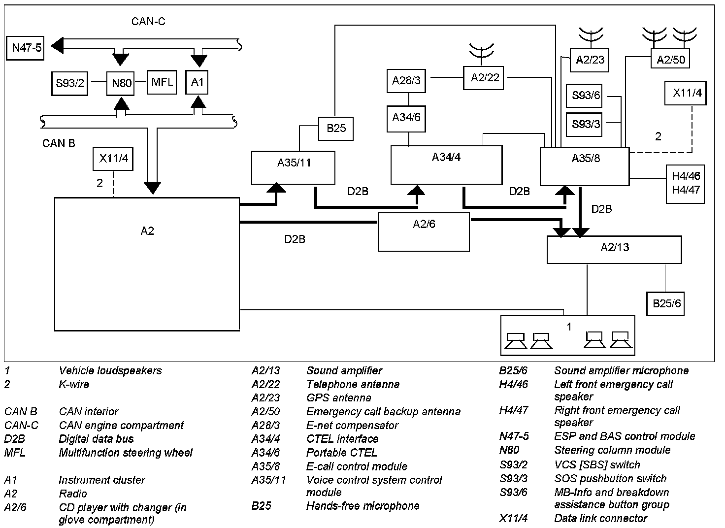 The voice control system control module (A35/11) is connected with the radio (A2) and the E-call control module (A35/8) via the Digital Data Bus (D2B). The voice control system is used for telephone operation as well as for some audio operating functions (e.g. station search function, track change function for CD). The audio source is automatically muted during a telephone call. The phone call can be listened to at increased volume via the vehicle speakers.