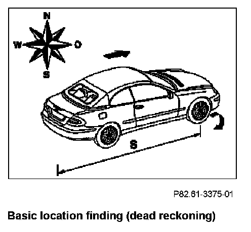 Continuous position finding is understood to refer to calculation of the vehicle's position at any given time. It is active when the ignition is switched on (circuit 15R ON) and is performed by the navigation processor, which is integrated into the COMAND operating, display and controller unit (A40/3). During the switch-on phase (software is loaded), only the basic position finding is available. After switching the ignition off (circuit 15R off), all important positioning parameters are stored for the duration of the run-on time (approx. 30 min).