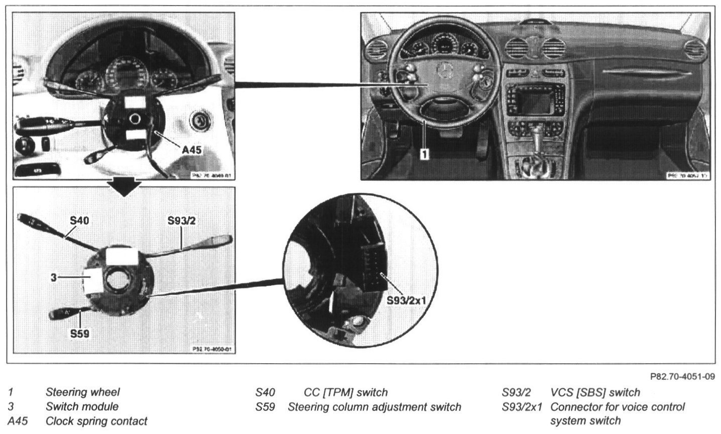 NOTE: Detach switch module (3) with voice control system switch (S93/2), cruise control pushbutton switch (S40) and steering column adjustment switch (S59). An electric connection is established using a fixed socket flange.