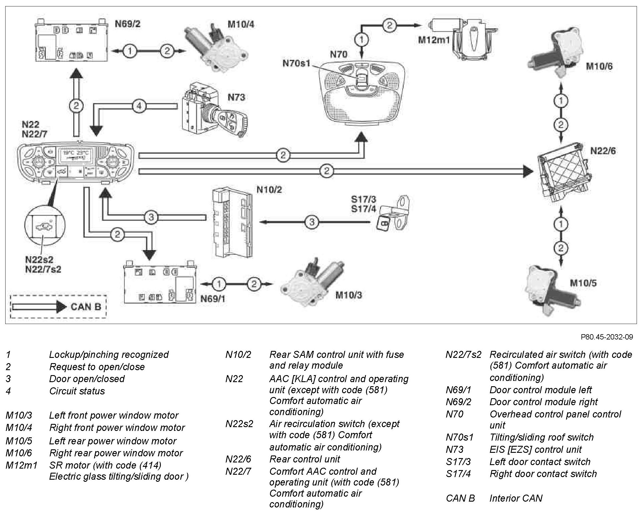 When the air recirculation switch (N22s2 or N22/7s2) on the AAC [KLA] control and operating unit (N22) or on the comfort AAC control and operating unit (N22/7) is actuated, the windows and the tilting/sliding roof can be closed completely. The actuation request is relayed by the AAC [KLA] control and operating unit (N22) or comfort AAC control and operating unit (N22/7) via the interior CAN (CAN B) to the