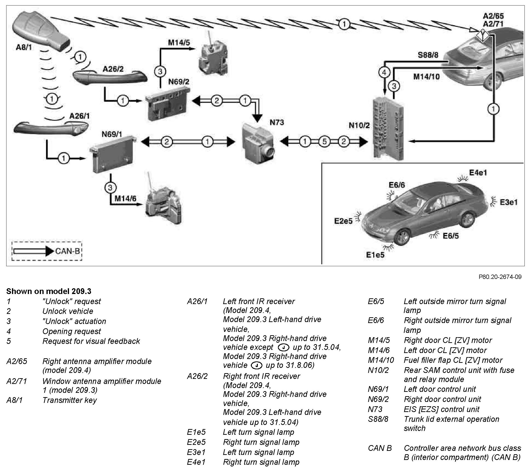 Parallel to the radio signal, an infrared signal is transmitted to the left front IR receiver(A26/1) or right front IR receiver (A26/2) (precise aiming required). This signal is read in by the left door control unit (N69/1) or right door control unit (N69/2) and is transmitted to the EIS control module (N73) via the CAN-B bus (CAN-B).