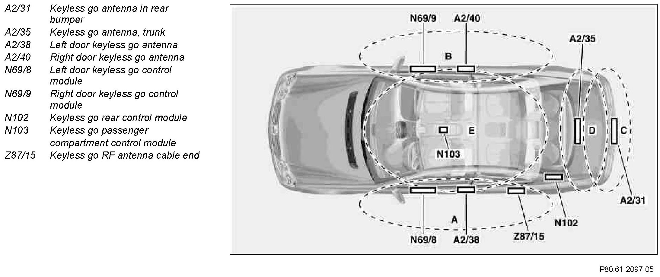 ^ The Keyless go rear bumper antenna (A2/31) is actuated by the Keyless go rear control module (N102) and covers area C. Keyless go antennas (A2/31, A2/38, A2/40) ensure a range of approx. 1.5 m and are actuated by a frequency of 20 kHz.
