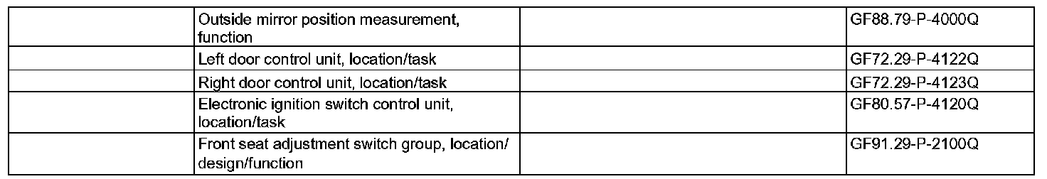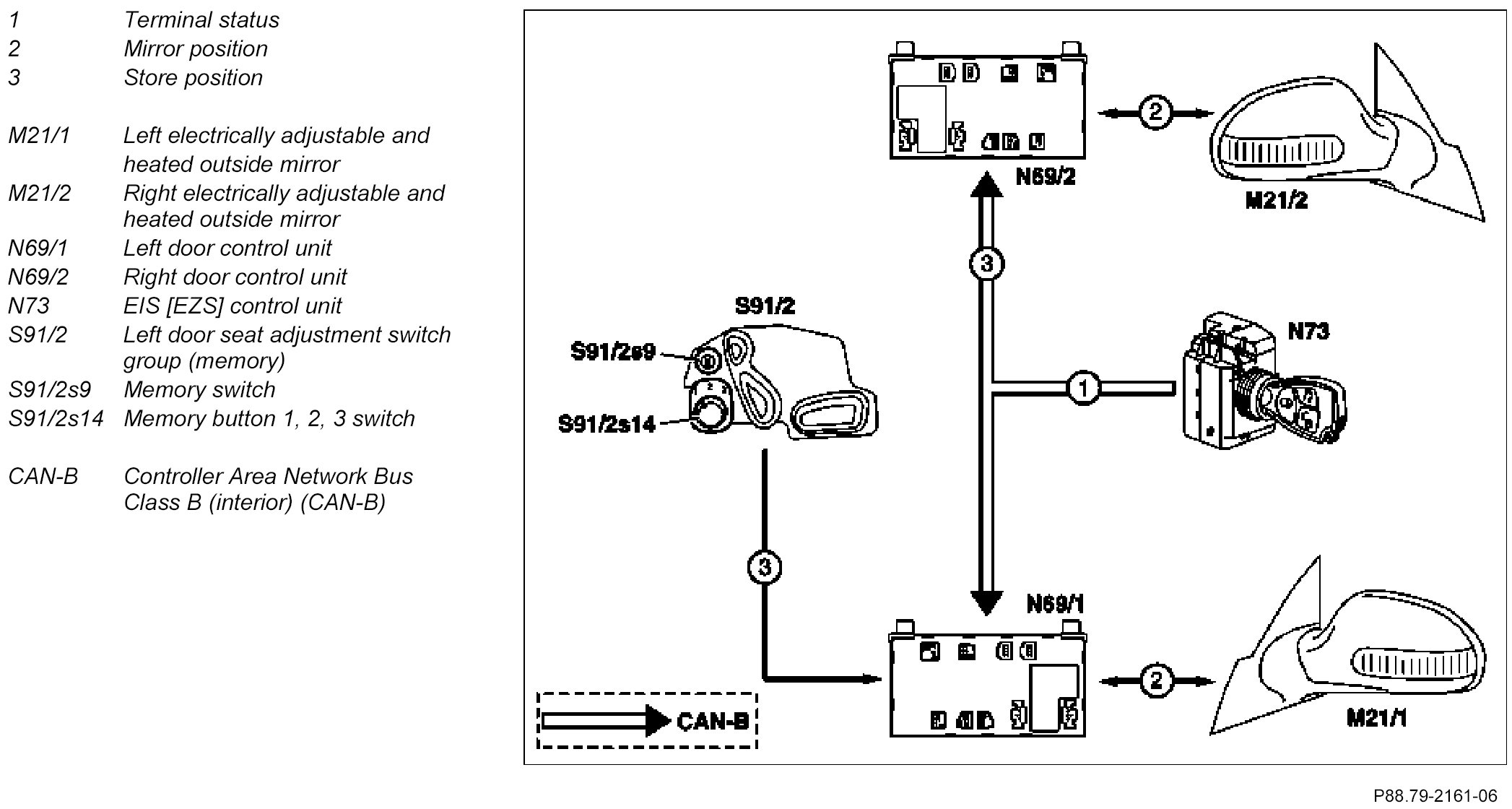 The position of the heated and electrically adjustable outside mirror, left (M21/1) and right (M21/2) are stored in the left door control unit (N69/1) and right door control unit (N69/2).