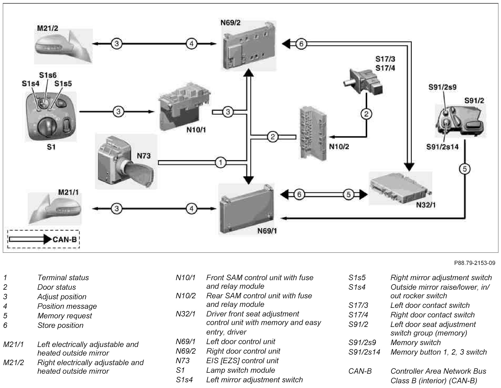 For storage of an outside mirror position, the left door seat adjustment switch group (memory) (S91/2) has memory location 1, 2, 3 switch (S91/2s14) as well as the memory switch (S91/2s9) required for starting the storage operation. The signal for storing the position of the left front door control unit (N69/1) is relayed via the CAN-B bus (CAN-B) and is read in by the diver-side front seat adjustment control unit with memory and convenience entry (N32/1).