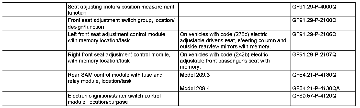 For the driver seat the set seat positions can be stored via the memory location 1, 2, 3 switch (S91/2s14) and the memory switch (S91/2s9). Whether the storage is to be key-related or not can be activated or deactivated in the instrument cluster. For each transmitter key up to 3 seat positions can be stored.