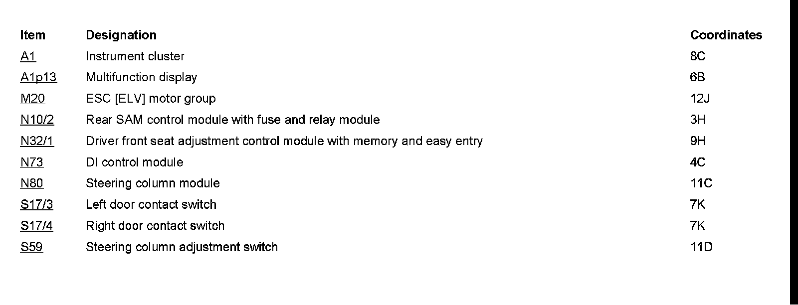 Component Description/Coordinates, A1 - S59: