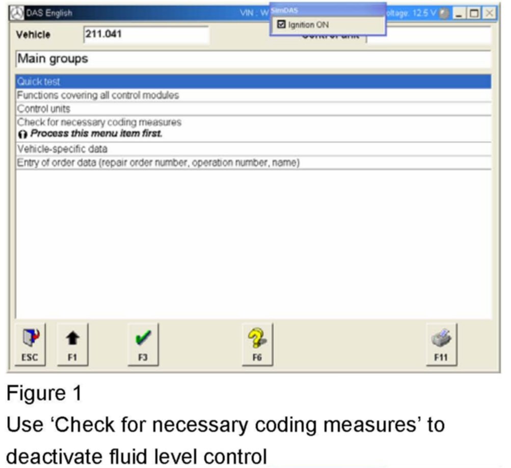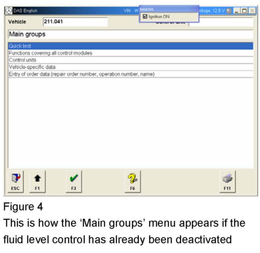 Model 171, 211 and 219: If the fluid level control is still active, there will be a menu item in 'Main groups' labeled 'Check for necessary coding measures' (Figure 1). Process this menu item to deactivate the coding of the fluid level controls (Figure 2 and 3). If the fluid level control is already inactive, this additional menu item will not appear when "Main groups" is selected (Figure 4).