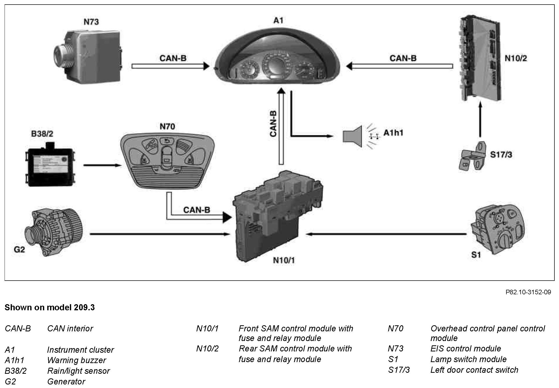 The rear SAM control module with fuse and relay module (N10/2) detects the open door from the signal of the left door contact (S17/3) and transmits the CAN message "door open" to the instrument cluster (A1) via the interior CAN (CAN-B).