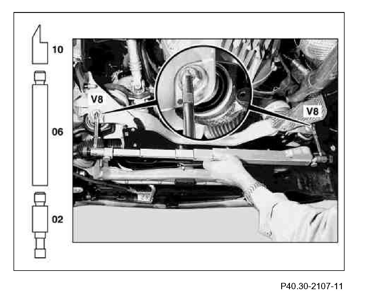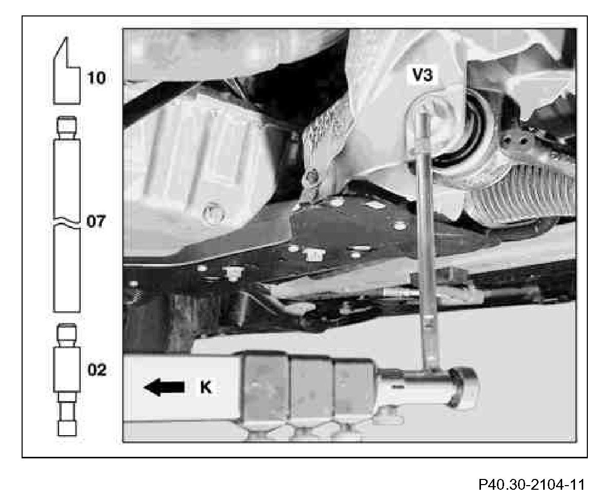 Measured from check bore (K) to the ball head bolt on the torque strut (18), left to right. The bearings at the tension arm and cross strut must be in perfect condition in order to assess the consequences of an accident. Because of the inaccuracies resulting from the tolerances of the bearings, the dimension (V1) is only usable to a certain extent.