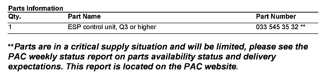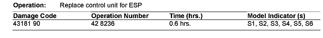 If you encounter customer reports in the above model vehicles of loss of the speed sensitive power steering feature, check the Q level of the ESP control unit. It must have a Q level of Q3 or higher, if not install a new ESP control unit with status level Q3 or higher. The Q level can be found next to the part number on the control unit. This condition may be caused by a software error in the ESP control unit and fault code C1600 may be stored in the ESP control unit. For ESP control unit installation instructions, refer to WIS document no. AR42.45-P-0820P.