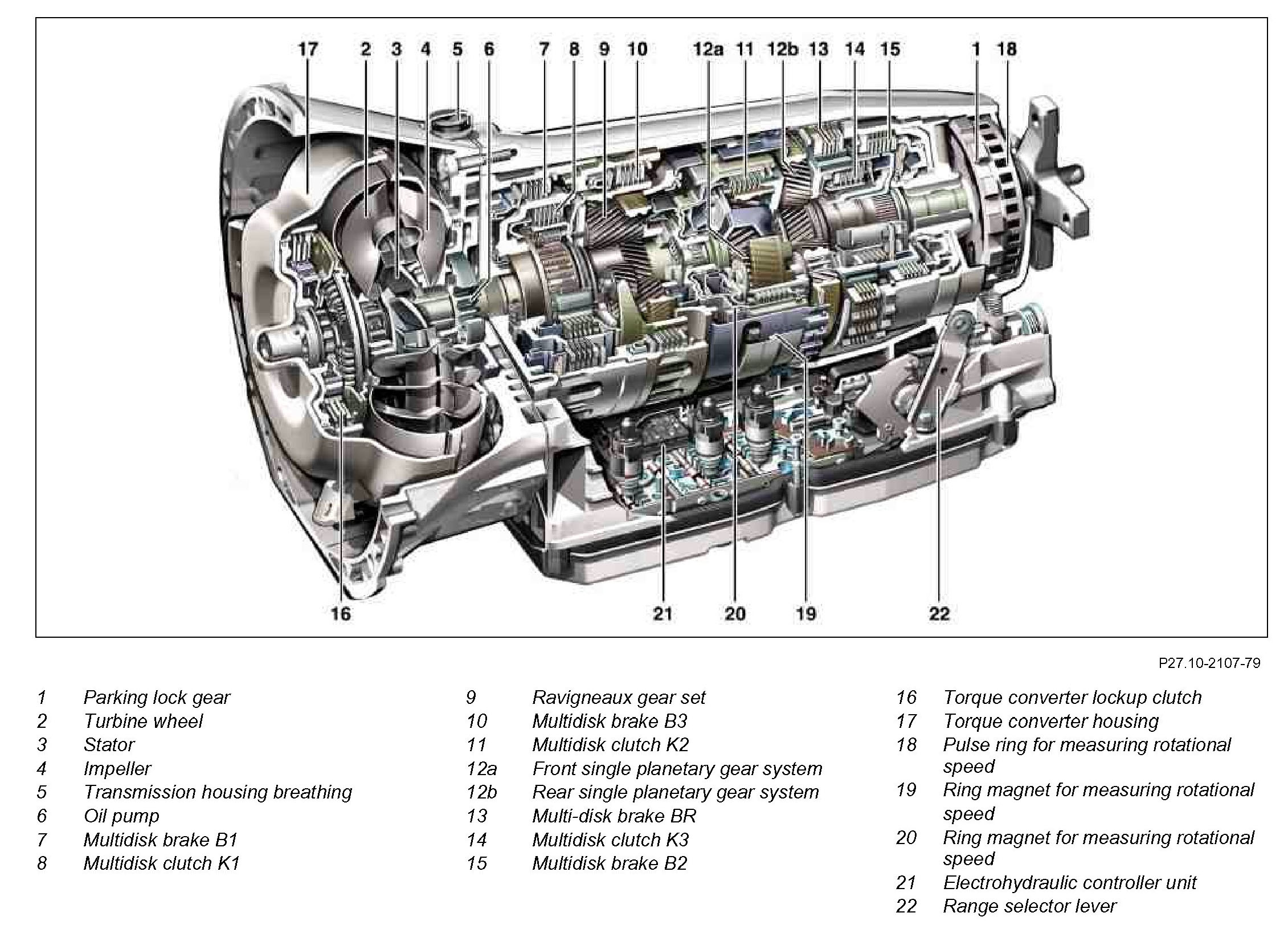 Transmission 722.9 is an electronically controlled automatic transmission with 7 forwards and 2 reverse gears. All transmission functions and transmission components have been combined in an assembly module. Integrating the electrohydraulic controller unit (21) in transmission 722.9 minimizes the number of interfaces to the wiring harness. The electrohydraulic controller unit (21) is installed at the bottom of the transmission housing. It is constantly flushed with transmission oil and cooled as a result.