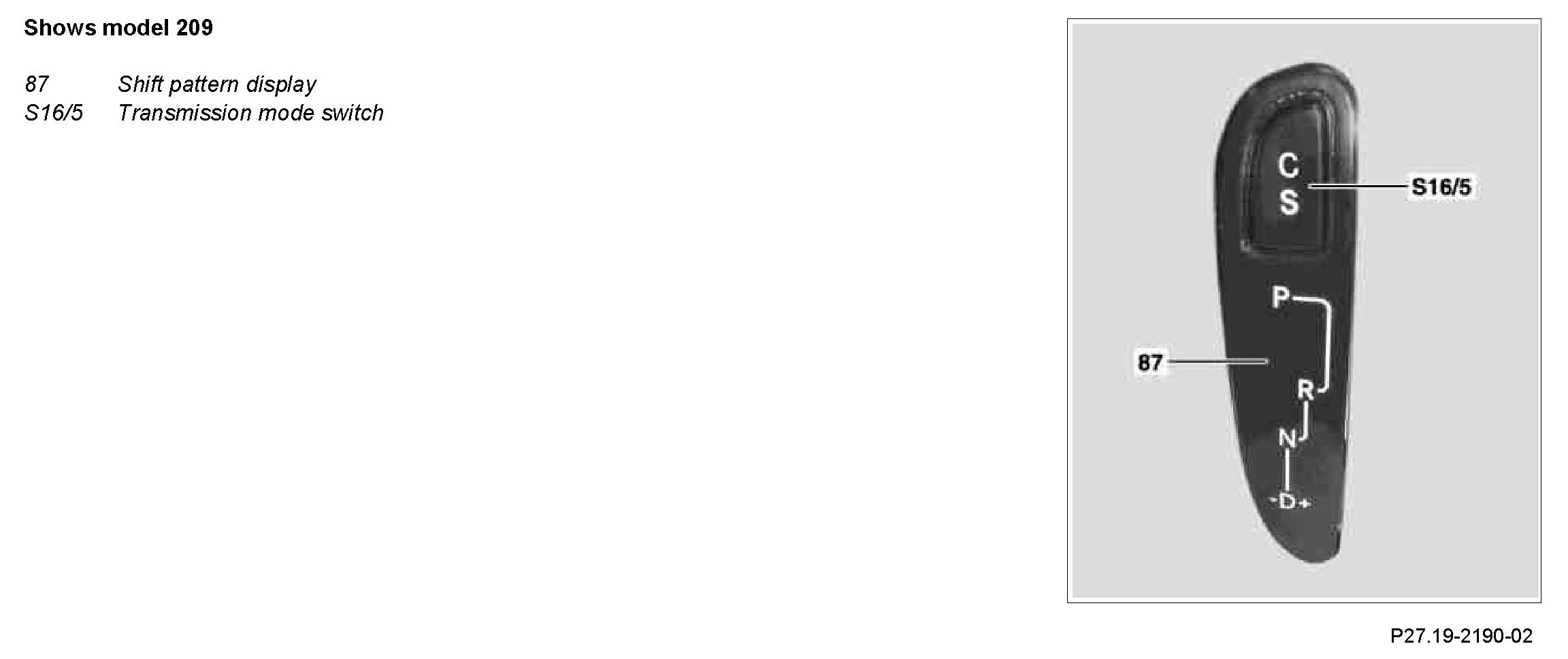 The program selection performed at the transmission mode switch (S16/5) only remains stored after a driving time of approx. 1 minute and is then displayed again once the engine is started again. The driving time of approx. 1 minute is necessary because of the system. The selector diagram system of symbols (87) is illuminated when the driving lamps are switched on
