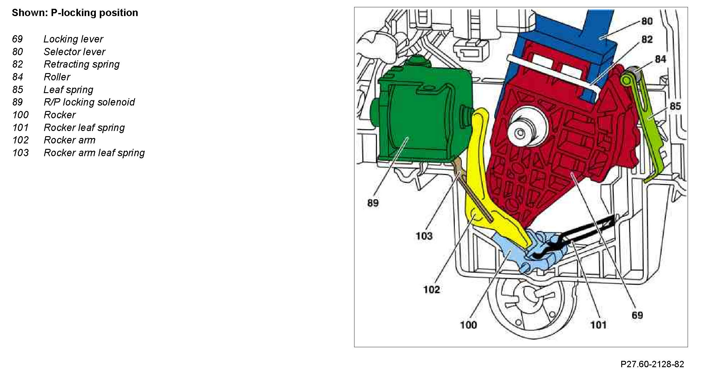 Under these conditions the rocker (100) is held in front of the locking lever (69) by the spring force of the leaf spring of the rocker (101). It is not possible to shift the selector lever (80) out of selector lever position "P". The R/P locking solenoid (89) is actuated with "circuit 15 ON" and when the brake pedal is pressed. The rocker arm (102) presses on the rocker (100); the selector lever (80) can be shifted out of selector lever position "P".