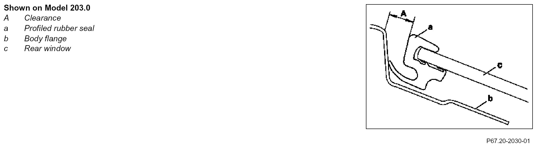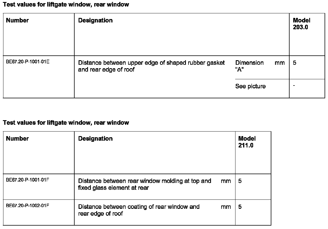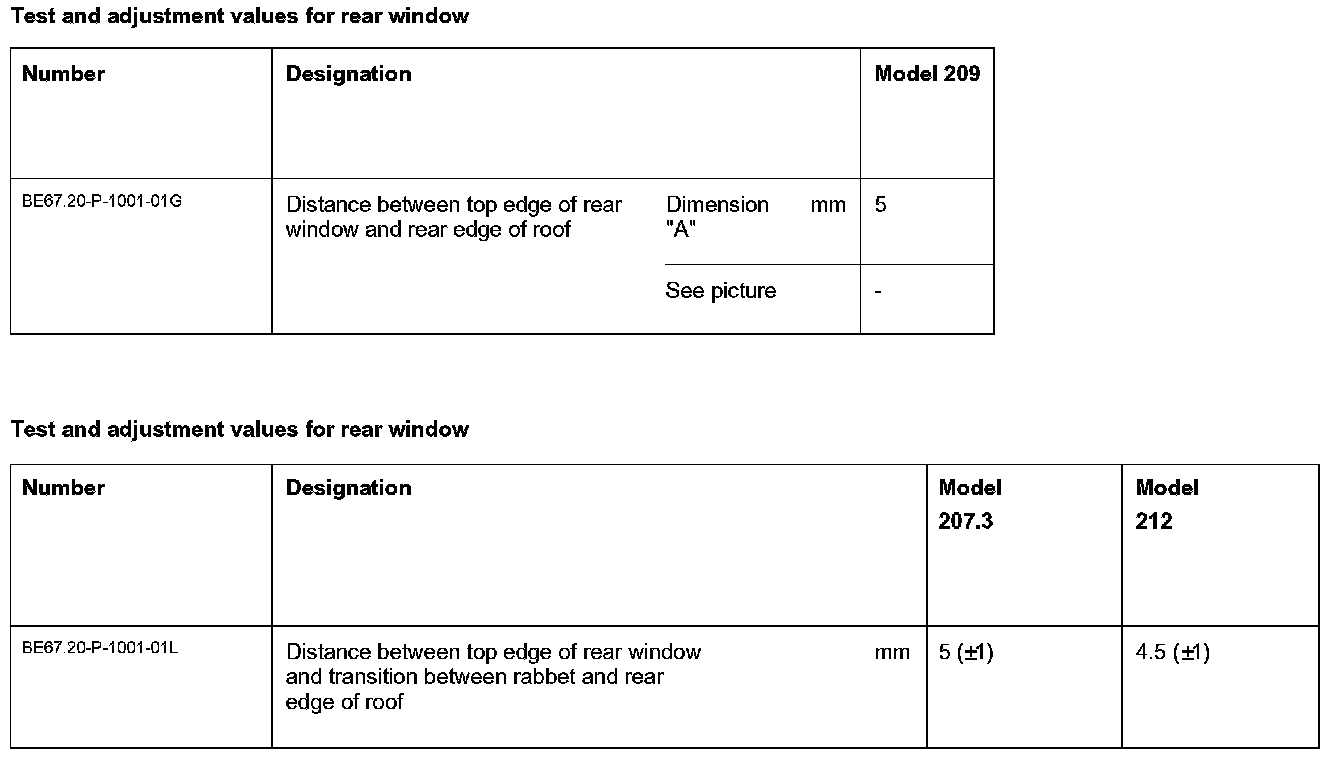Adjust distance dimension (A) with the aid of the feeler gauge On model 197.3 and model 230.4 with code (P99) Special model "AMG Black Series" the rear window (c) is not adjusted with the feeler gauge but with the help of an assistant is aligned centrally and parallel with the body opening.