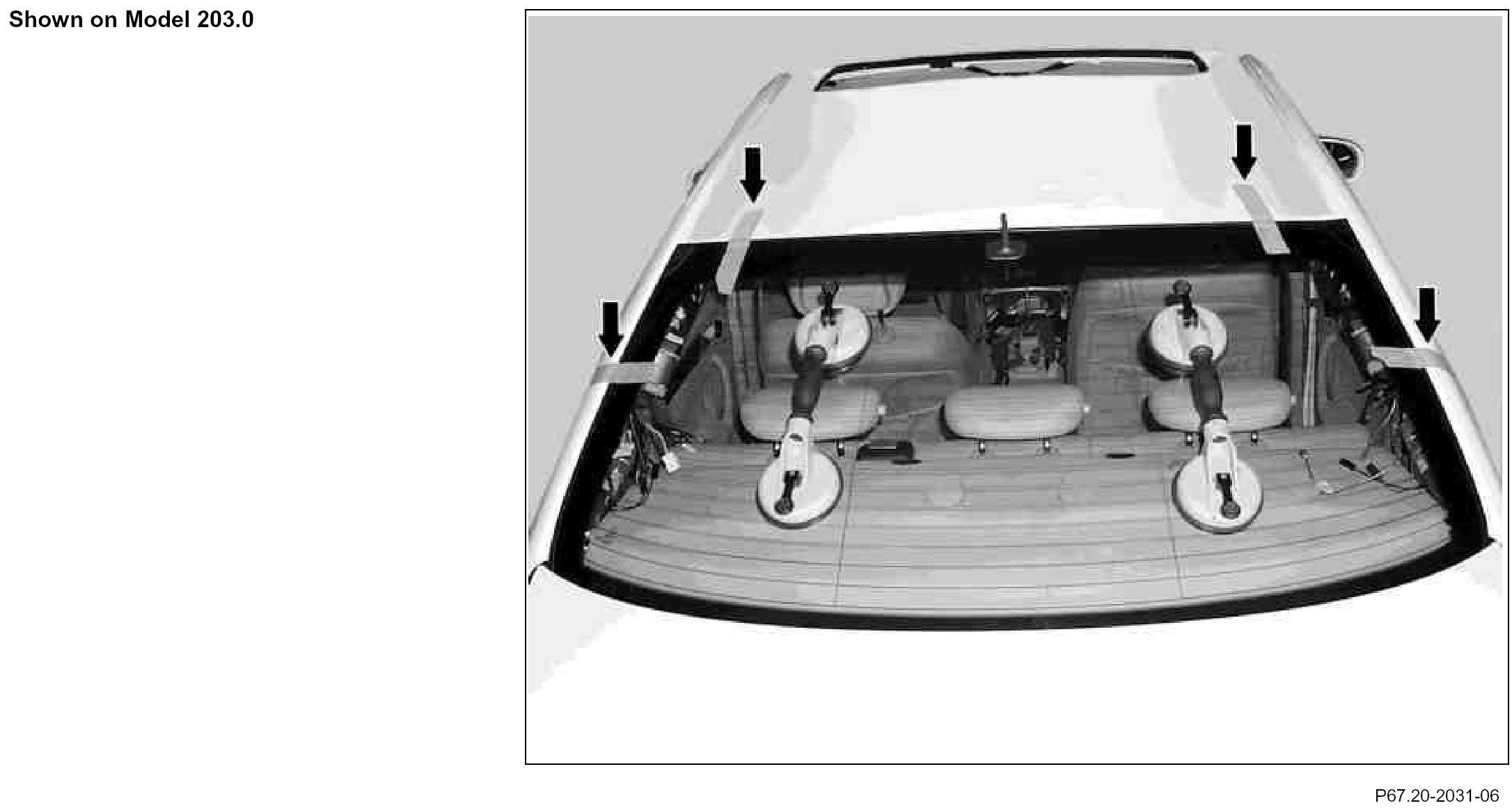 5.1. On model 203.0, 207.3, 209.3, 211.0, 212.0/1 and 230.4, cut adhesive strips (arrows) at outer edges of rear window.