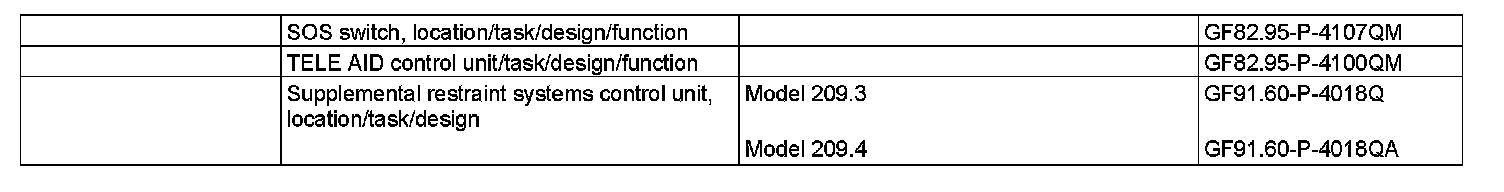 The restraint systems control unit (N2/7) cyclically performs a self test. A fault in the system is indicated by flashing red LEDs in the SOS pushbutton switch (S93/3) in normal operation. The corresponding fault message (status message) is displayed in the display of the COMAND operating, display and control unit (A40/3) and in the multifunction display (A1p13) of the instrument cluster (A1). The red LEDs remain active until either circuit 15 is switched off or the error is rectified. The SOS pushbutton switch (S93/3) is monitored. A stuck SOS pushbutton switch (S93/3) is detected. False signals are ignored and the system remains operational.