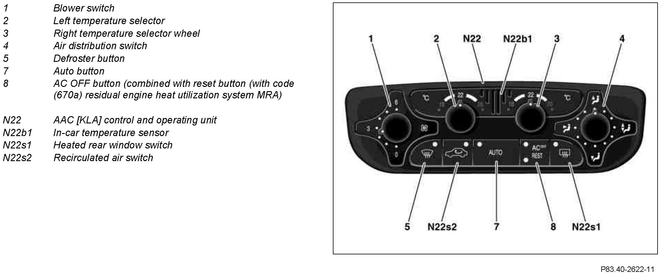 The AAC [KLA] control and operating unit (N22) compares the desired temperature to the temperature in the vehicle interior, which is measured by the in-car temperature sensor (N22b1) in the AAC [KLA] control and operating unit (N22)