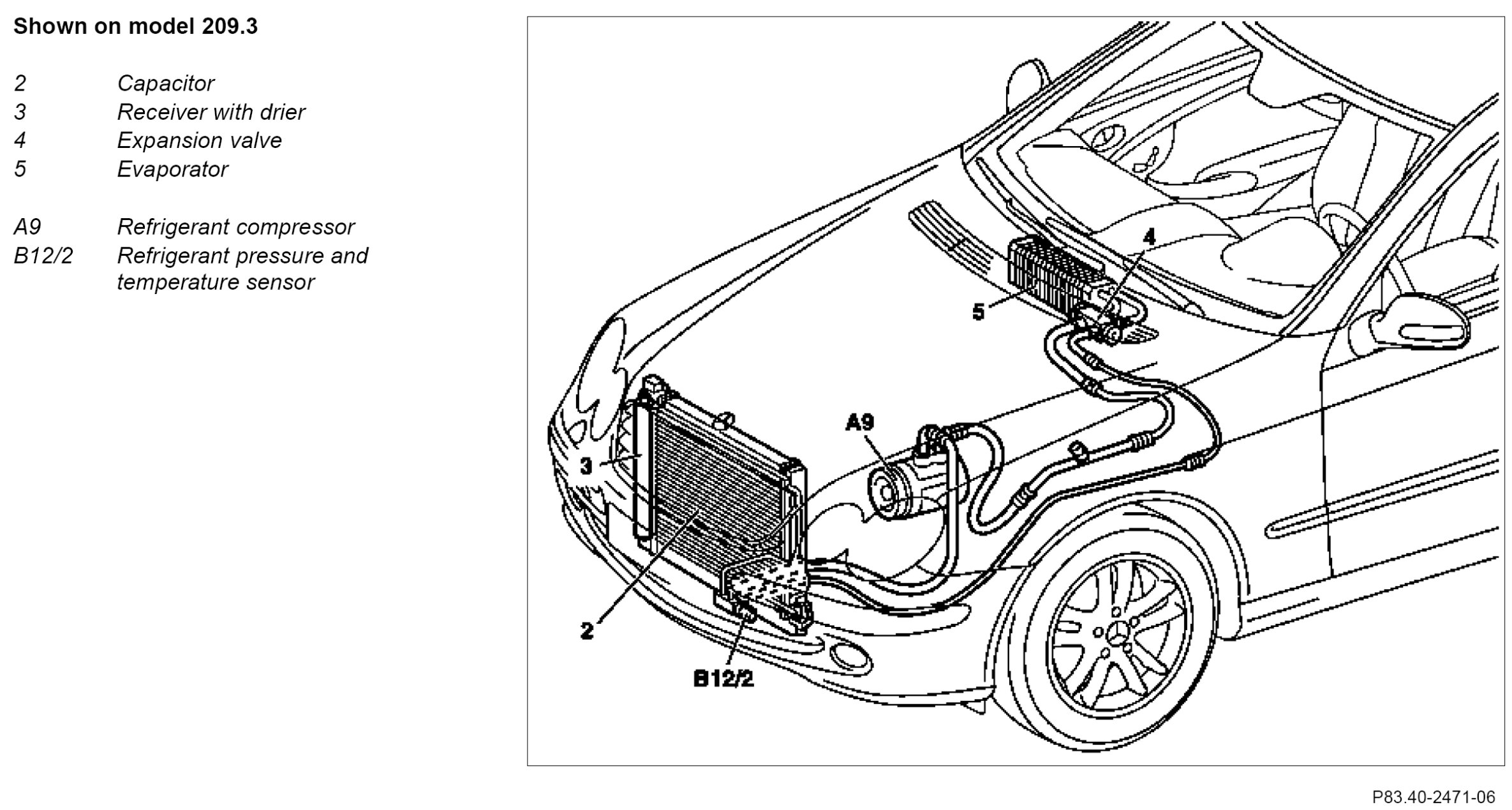 The refrigerant compressor (A9) draws in the coolant which has turned gaseous through the collection of heat and compresses it again.