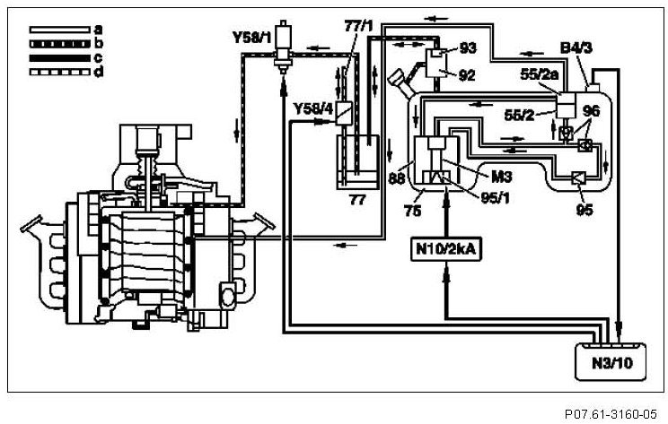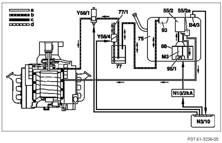 The activated charcoal canister shut-off valve (Y58/4) is closed and the purge control valve (Y58/1) opened. The vacuum in the intake manifold reaches the fuel tank (75).