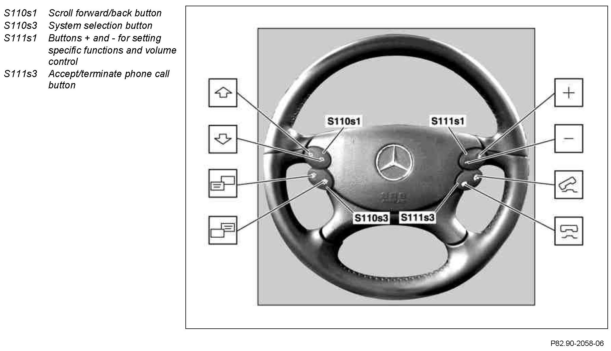 The right multifunction steering wheel button group (S111) contains the Accept/terminate phone call button (S111s3) and the button + and -, setting of specific functions and volume control (S111s1). A telephone call can be accepted or terminated with the Accept/ terminate phone call button (S111s3).