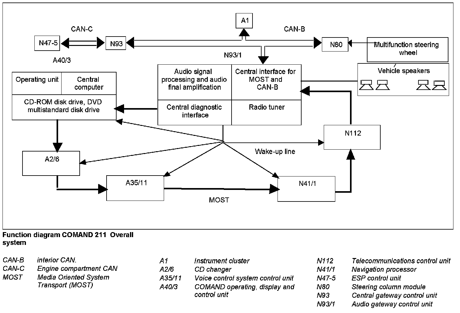 Via MOST (Media Oriented System Transport) data or signals are exchanged between the audio gateway control unit (N93/1), the COMAND operating, display and control unit (A40/3), the CD changer (A2/6), the telecommunications control unit (N112) and the voice control system control unit (A35/11).