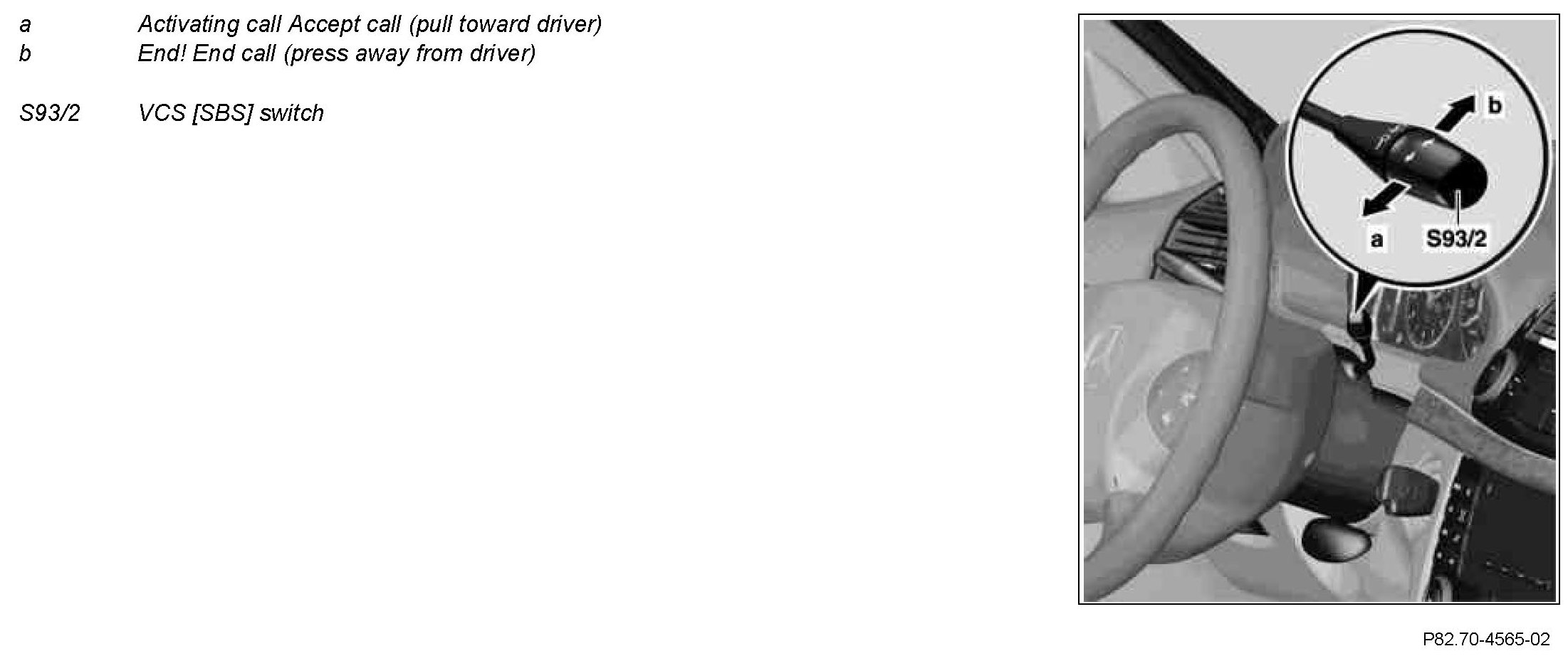 If the VCS switch (S93/2) is pushed away from the driver during a phone call, then the voice recognition of the voice control system is deactivated and the existing connection is terminated. The voice recognition is located in the voice control system control unit (A35/11).
