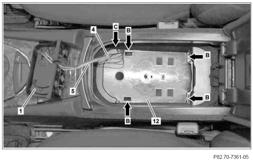 20 Place covering (13) into stowage compartment in center console and clip in the previously removed holder.