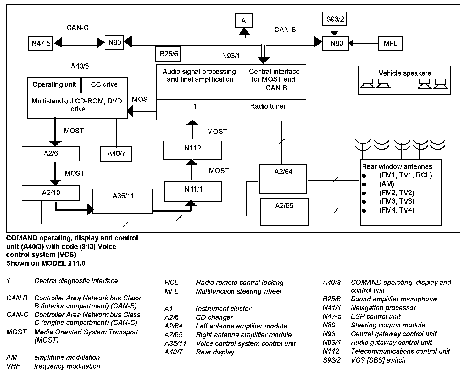 The COMAND TV system is controlled via the COMAND operating, display and control unit (A40/3). Communication between the COMAND operating, display and control unit (A40/3) and the TV tuner (A2/10) (with code (860) TV tuner) or TV combination tuner (analog/digital) (A90/1) (with code (863) Digital/analog TV tuner) takes place over the Media Oriented System Transport (MOST).