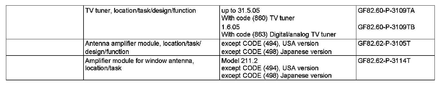 The 4 TV antennas in the rear window receive the TV high- frequency (HF) signals independently from each other. The video signal and sound signal are modulated on these high frequency (HF) signals. The right antenna amplifier module (A2/65) and amplifier module 2, window antenna (A2/72) filter the frequencies of the TV frequency bands out of the received HF signals and amplify them.