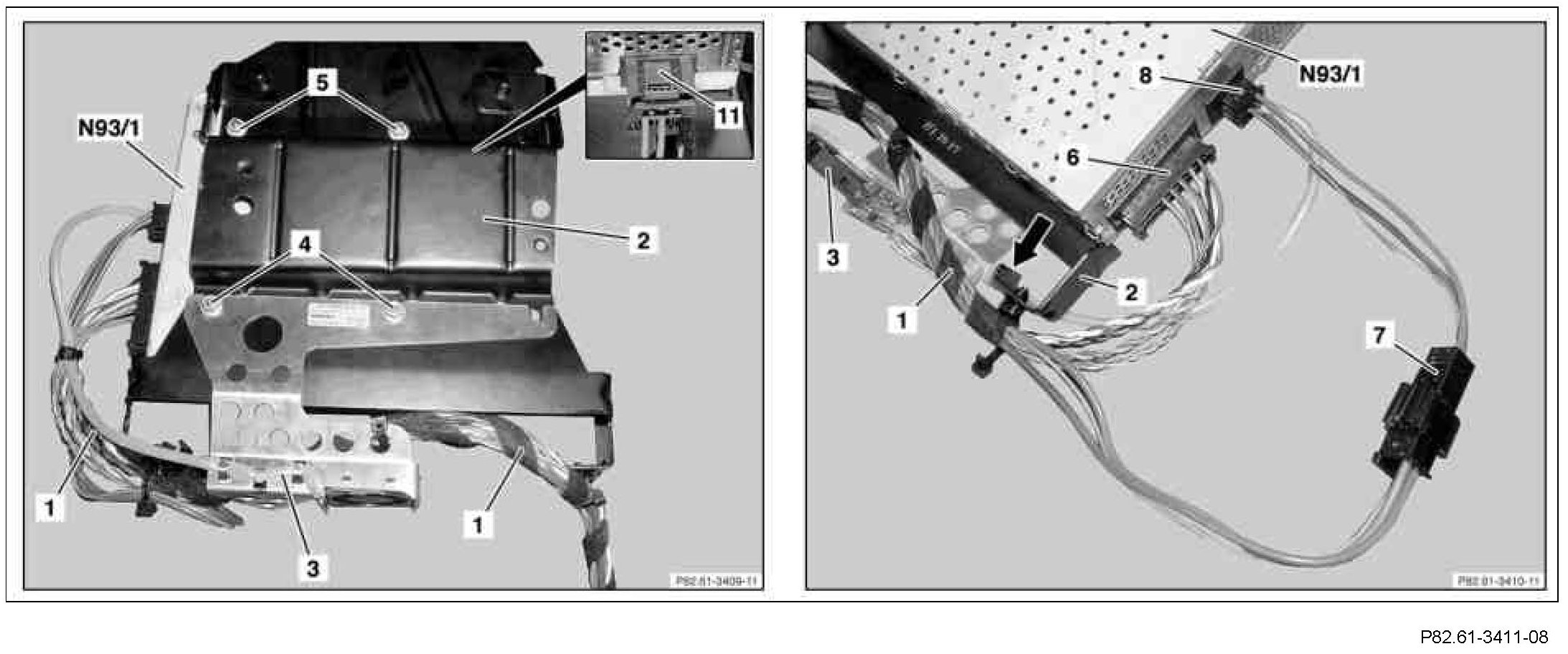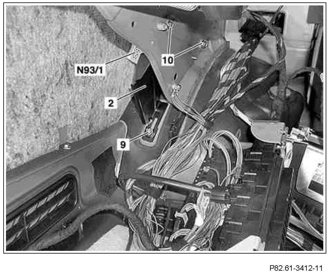 8 Place bracket (2) with audio gateway control unit (N93/1) onto left rear wheel arch.