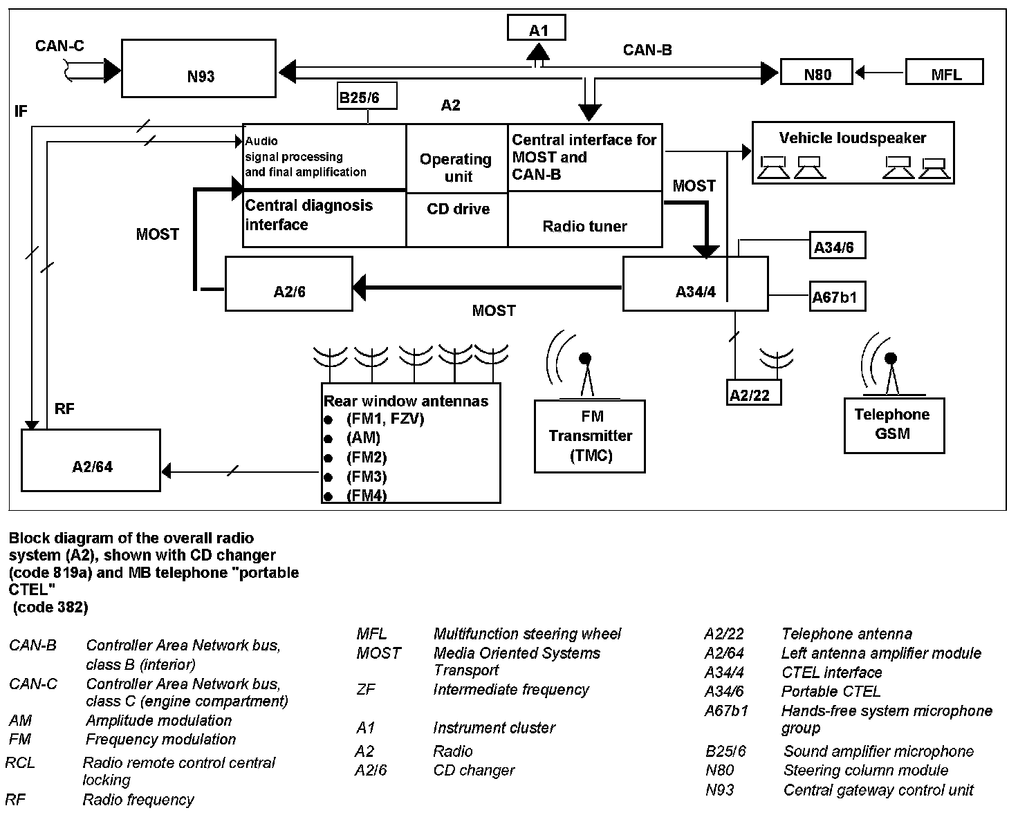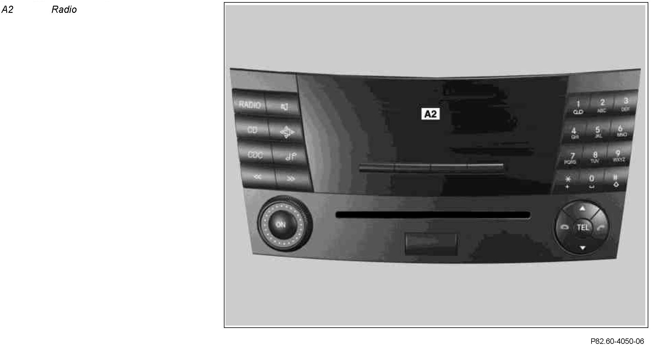 The radio (A2) is the central operating and display device for all integrated vehicle entertainment and communications systems on the MOST ring (Media Oriented Systems Transport). As such it is also known as a "one-box" system. It has a VFD display (transreflective technology) which is divided into 6 display fields for outputting information, such as assignment of function keys, function status and operating menus.