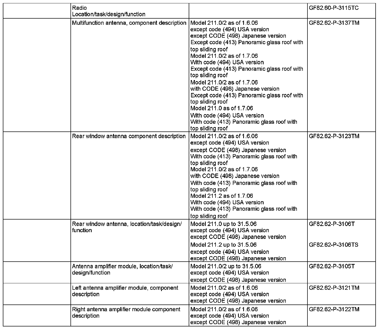 The antennas in the rear window receive high frequency (HF) signals for FM and AM (LW, KW). The music, voice, or data signals are modulated onto these HF signals. The left antenna amplifier module (A2/64) filters the radio frequency band frequencies from the received HF signals and amplifies these. The left antenna amplifier module (A2/64) then sends the amplified signals to the radio receiver.
