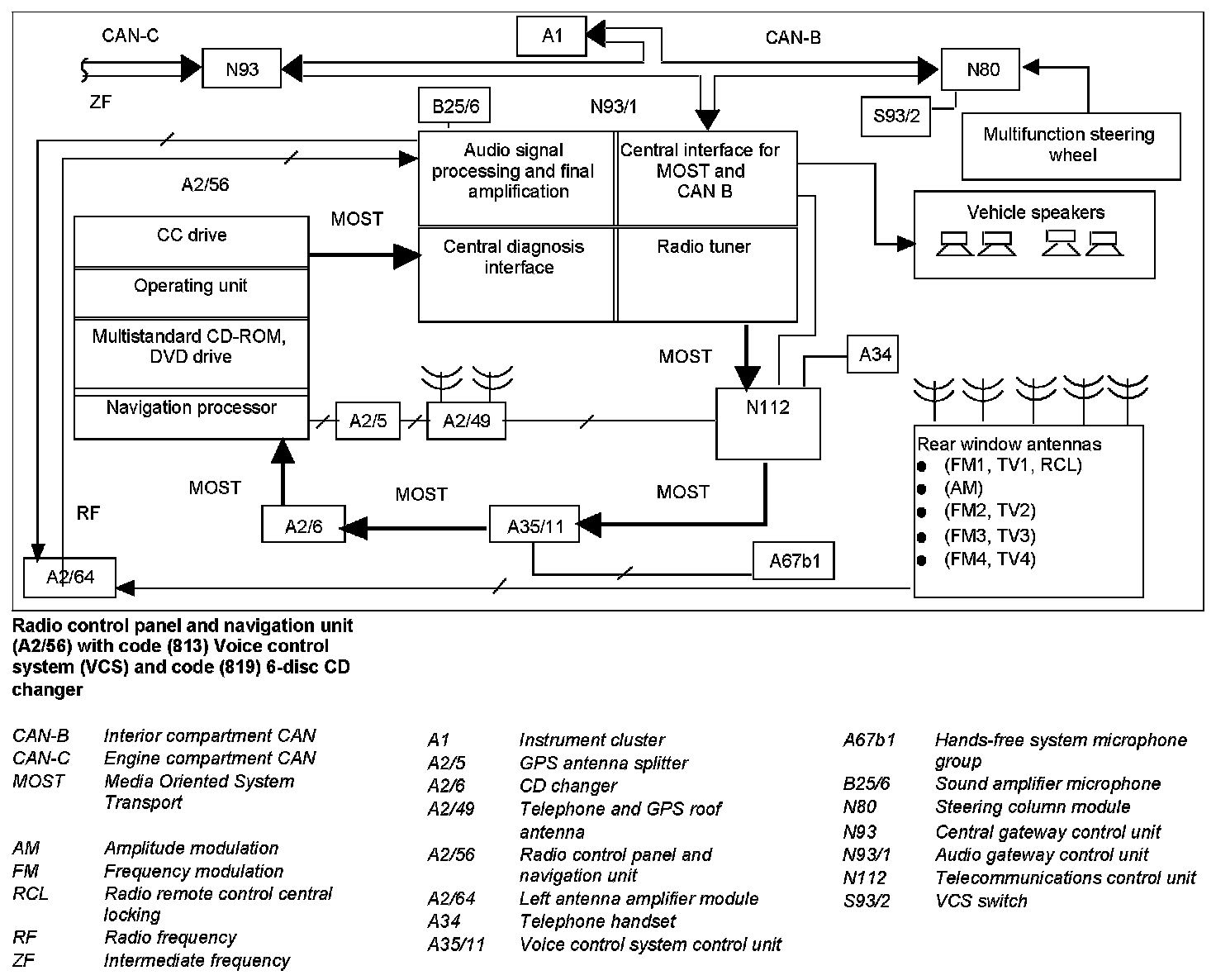 The control signals of the radio control panel and navigation unit (A2/56) as well as the audio data of the CD changer (A2/6) are transmitted via the Media Oriented System Transport (MOST). The audio gateway control unit (N93/1) takes over signal processing and amplification.