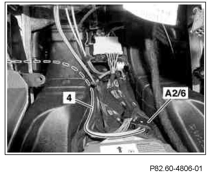 6 Route the new fiber optical cable module (4) from the connector for the CD changer (A2/6) into the left front footwell.