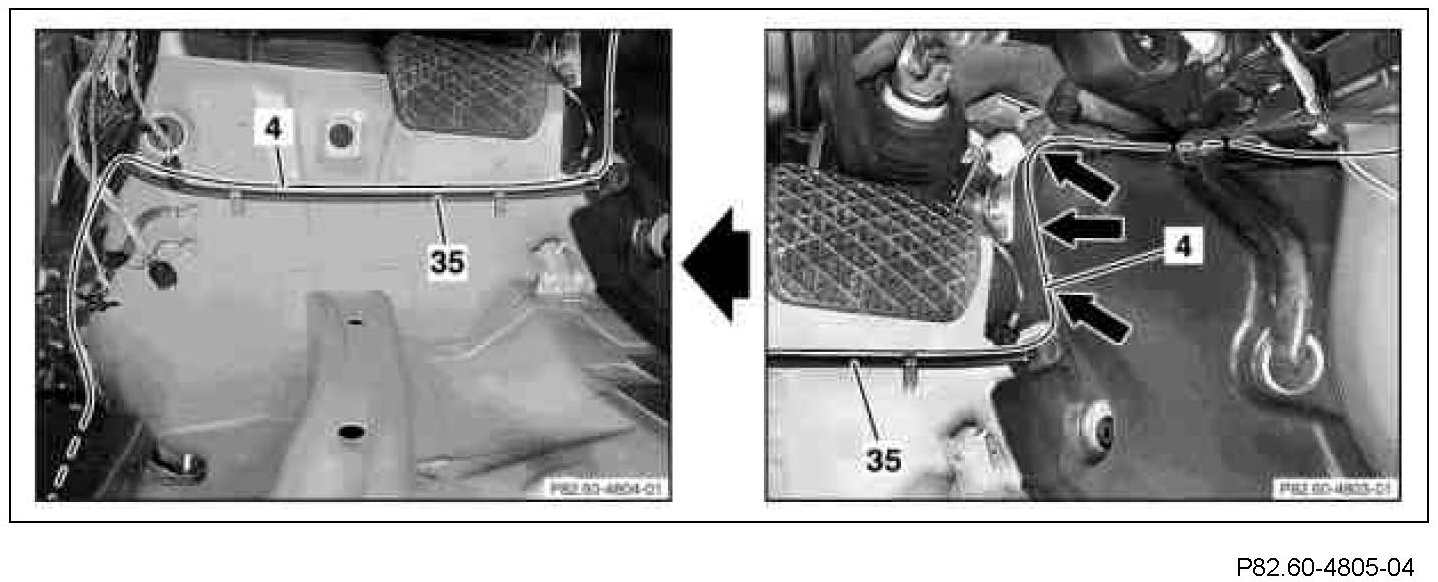 7 Route the new fiber optical cable module (4) from the connector for the CD changer (A2/6) into the left front footwell.