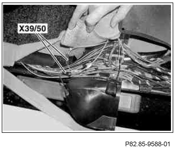 2 Remove the damaged fiber optical cable module 20 from the fiber optical cable connector (MOST) (X39/50), separate and strap down using insulation tape.