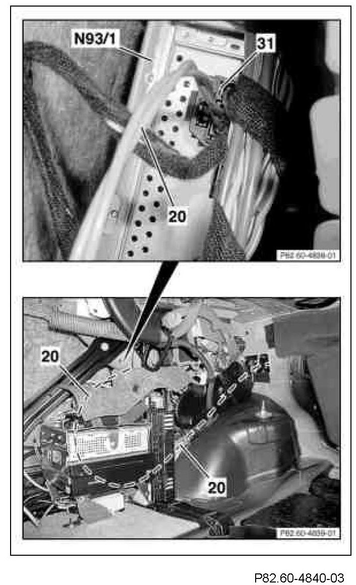 6 Route the new fiber optical cable module (20) along existing lines to the audio gateway control unit (N93/1) and fasten in place as per the guidelines.