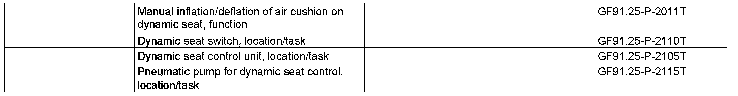 When cornering, a brief application of pressure in the outside lateral support cushions serves to additionally improve the lateral support. This happens essentially dependent on the instantaneous speed and the lateral acceleration. Depending on the ground speed and lateral acceleration - the data are forwarded over the CAN interior - the left front dynamic seat control unit (N32/19) actuates the valves of the air cushion lateral support (1). The air required to inflate the seat cushions is generated by the pneumatic pump for dynamic seat control (M40/1).