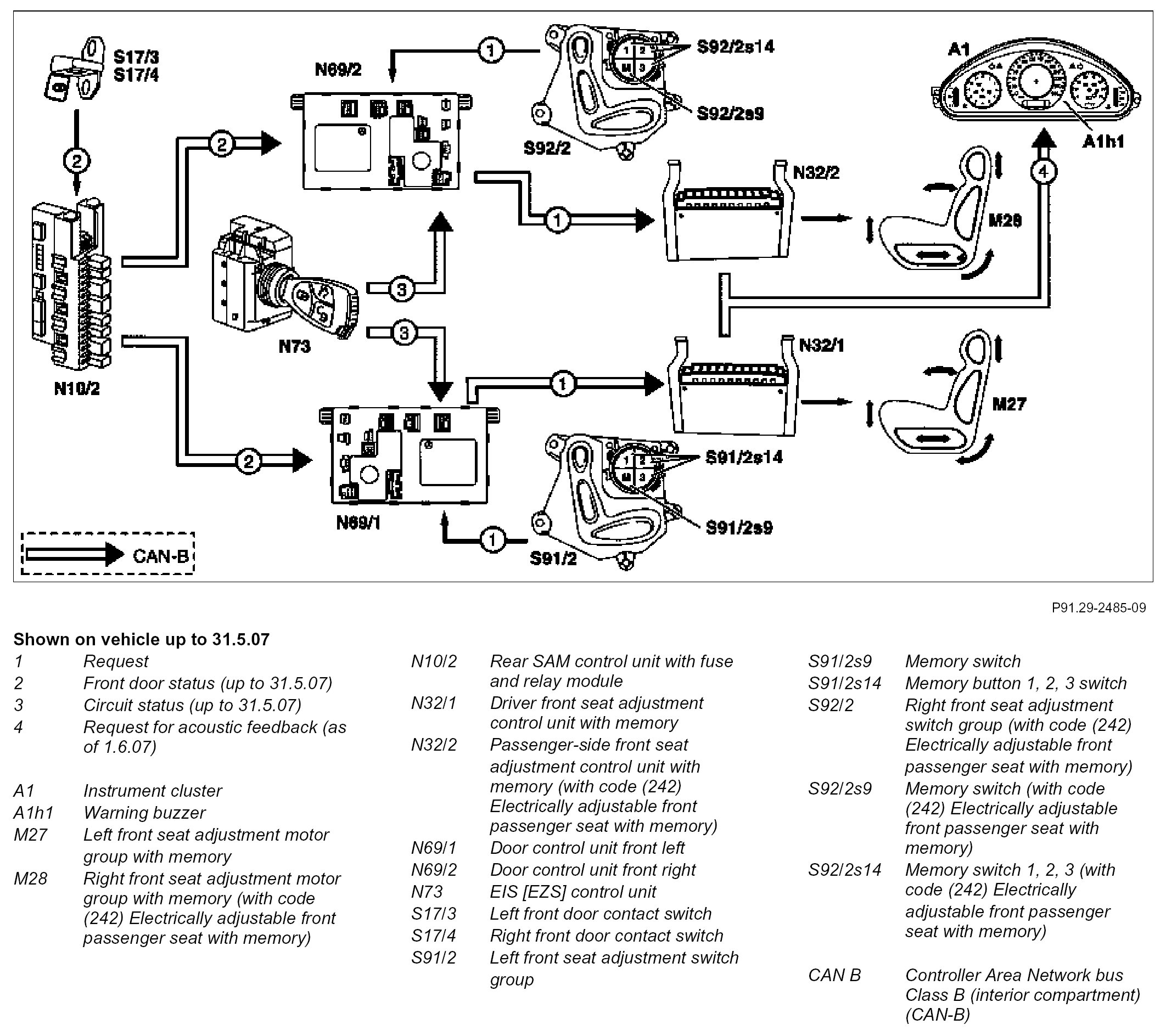 The memory button 1, 2, 3 switch (S91/2s14) and memory switch (S91/2s9) can be used to store the seat position set for the driver-side seat. The key-specific seat position storage (up to 30.5.05) can be activated or deactivated in the instrument cluster (A1). 3 seat positions can be stored for each transmitter key.