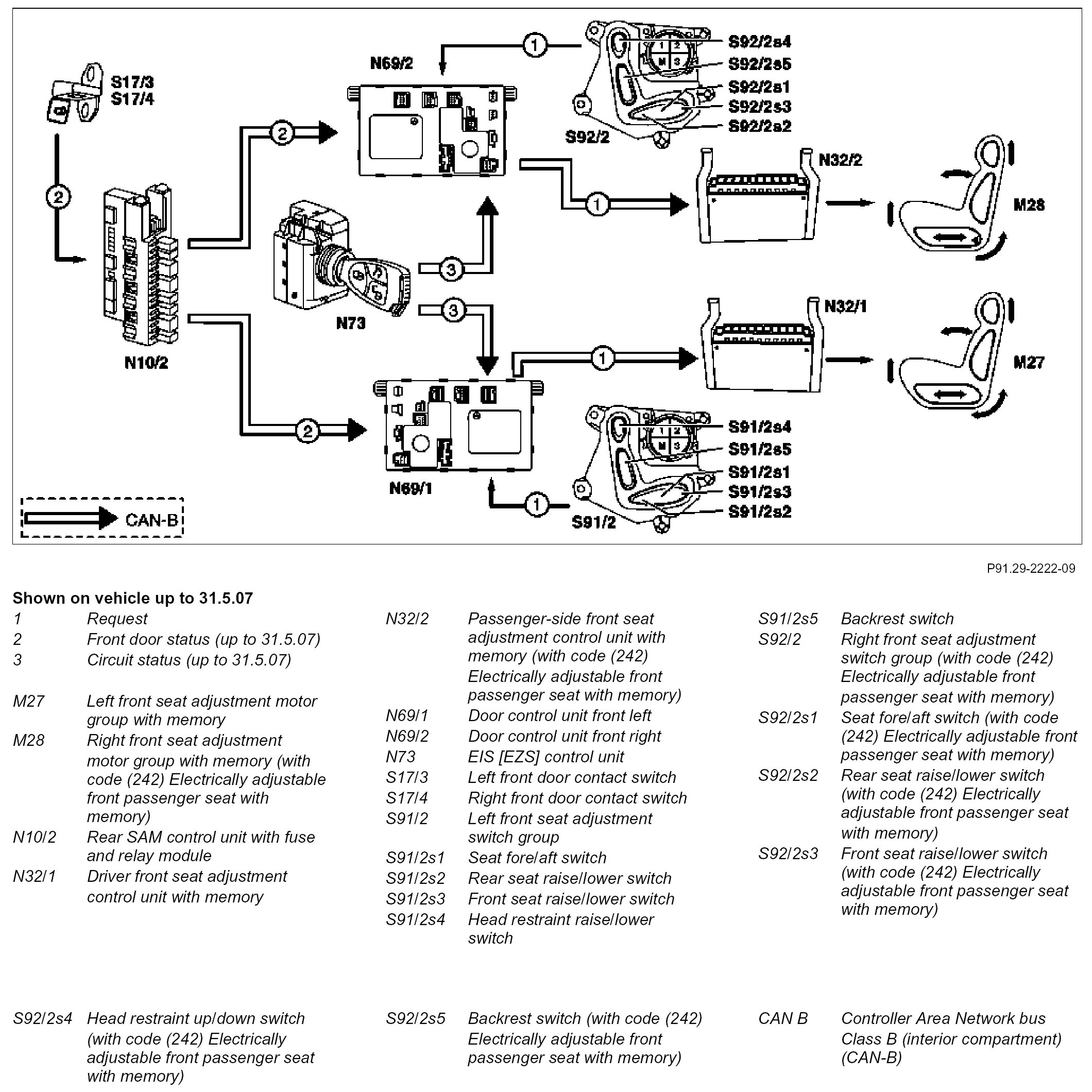 An adjustment request using the left front seat adjustment switch group (S91/2) is forwarded by the left front door control unit (N69/1) via the Controller Area Network bus Class B (interior) (CAN-B) to the driver-side front seat adjustment control unit with memory (N32/1), which then activates the left front seat adjustment motor group with memory (M27) accordingly.