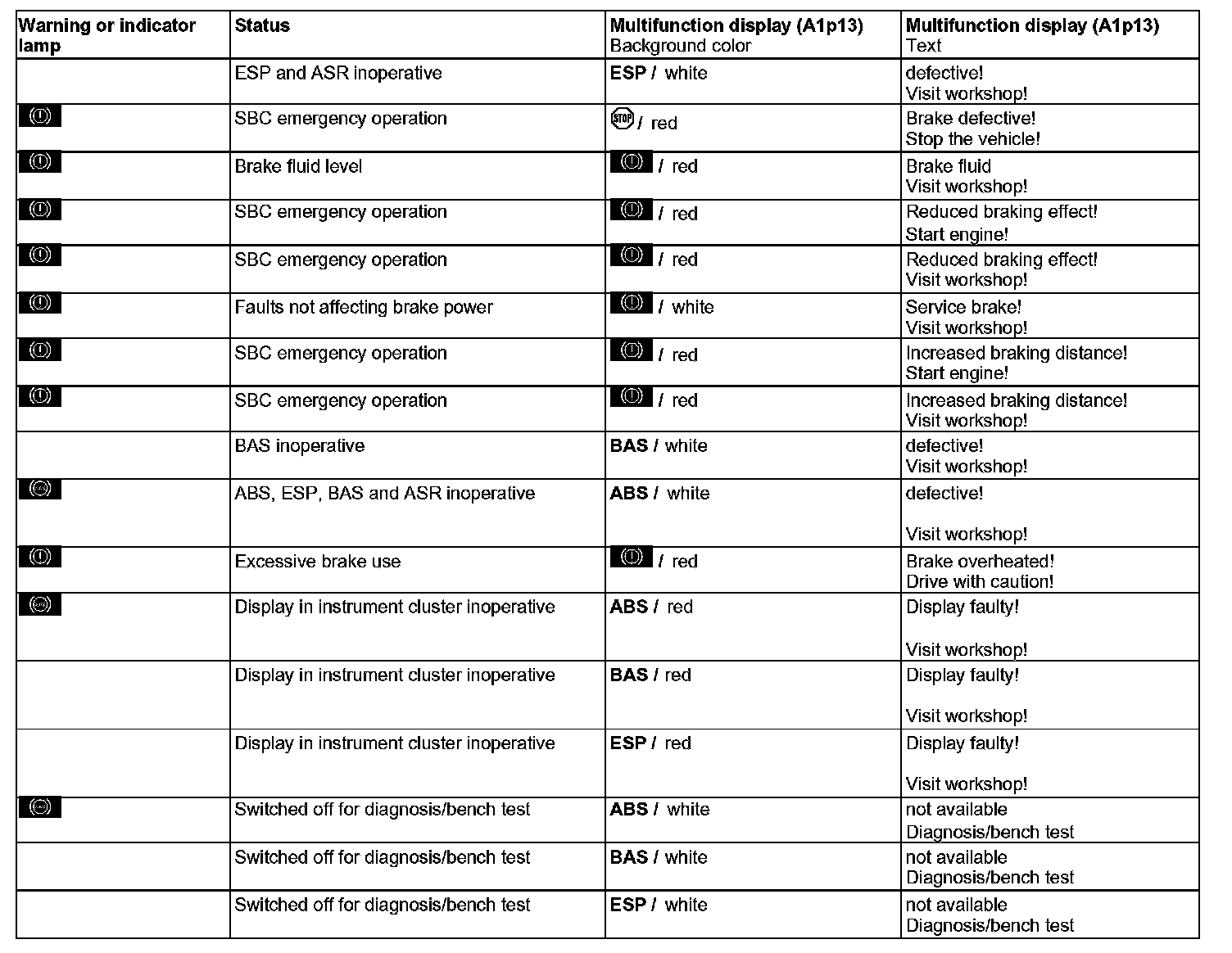 This lamp is actuated when there is a fault in the ABS system. ABS, ESP, and BAS are no longer available. Normal brake function is maintained. The fault is also shown in the multifunction display (A1p13).