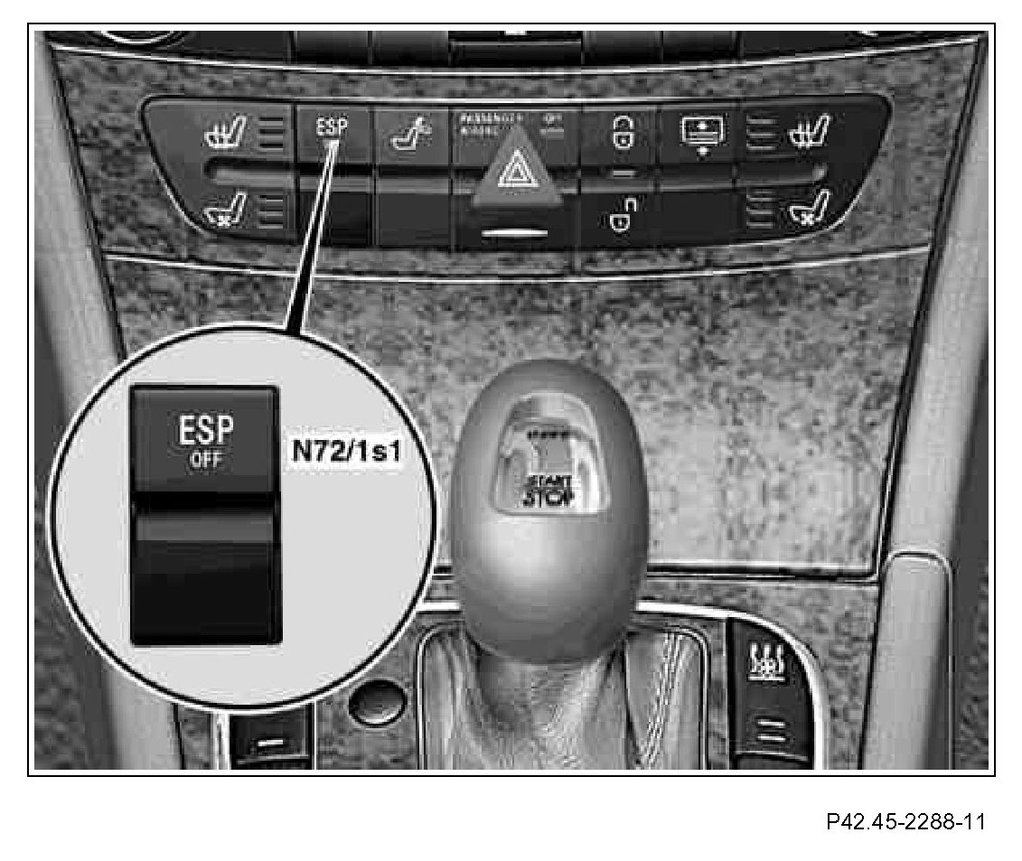 In such cases, the ESP can be deactivated. The drive torque control loop is then no longer active. A single-sided intervention by the may be effective whilst starting off up to a speed of 40 km/h. When the ESP OFF switch (N72s1s1) is operated the ESP and ABS warning lamp (A1e41) in the instrument cluster (A1) lights up permanently. It is to remind the driver that the ESP is switched off. If one or both drive wheels spin, the ESP and ABS warning lamp ([]e41) flashes (A1e41). This applies across the entire vehicle speed range.