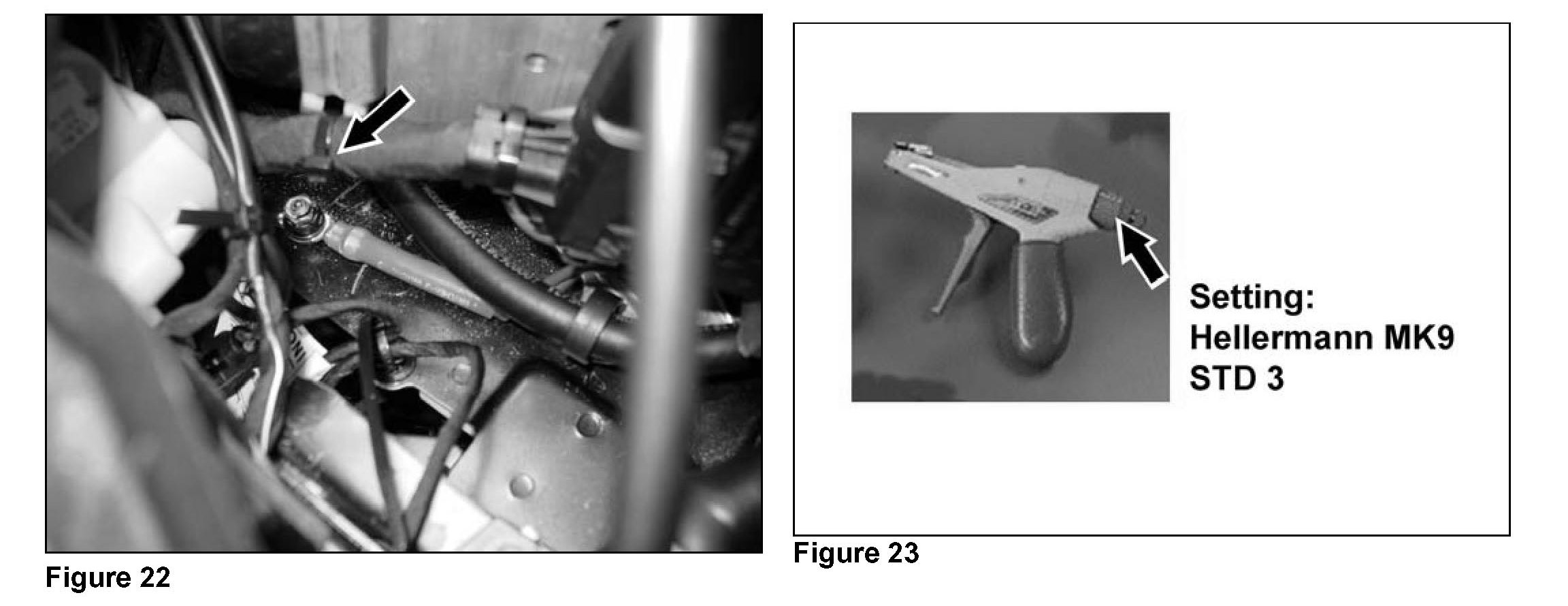 ^ Ensure cable tie (arrow, Figure 22) was properly affixed using cable tie pliers (Hellermann MK9; special tool number W 352 589 02 37 00); use setting 3 on cable tie pliers, as shown in Figure 23.
