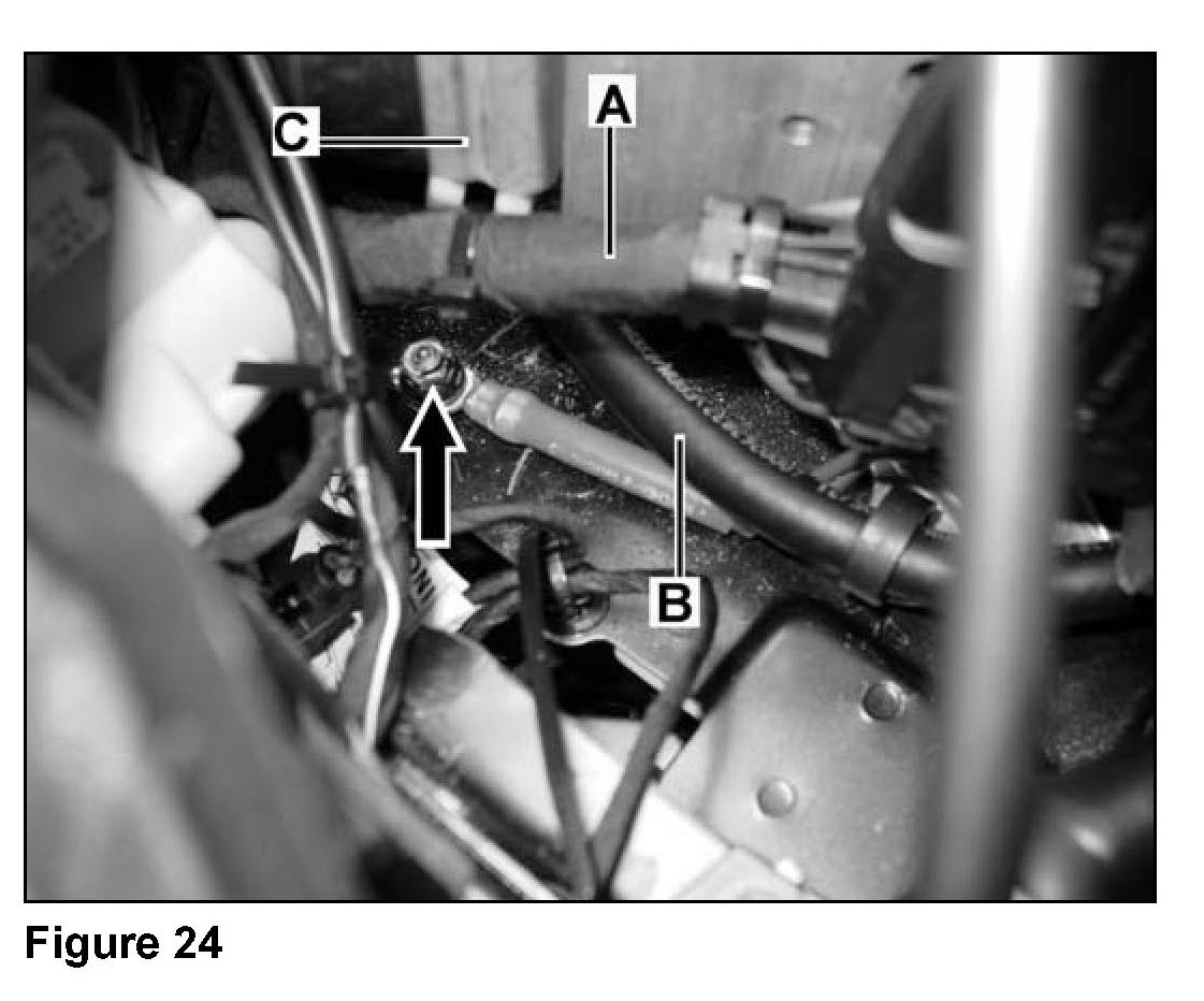 ^ Ensure wiring harness (A, Figure 24) touches the bracket (C, Figure 24) and is mounted there tension free.