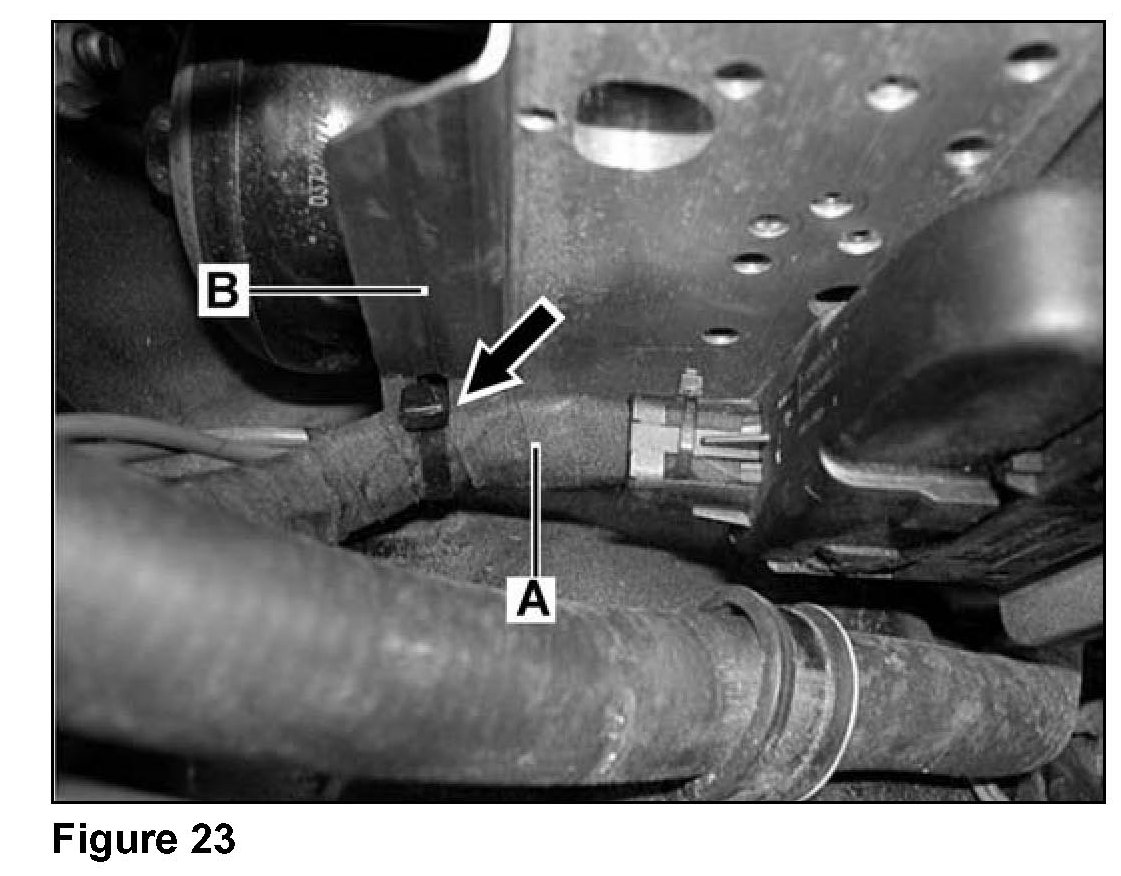 ^ Ensure wiring harness (A, Figure 23) touches the bracket (B, Figure 23) and is mounted there free of tension.