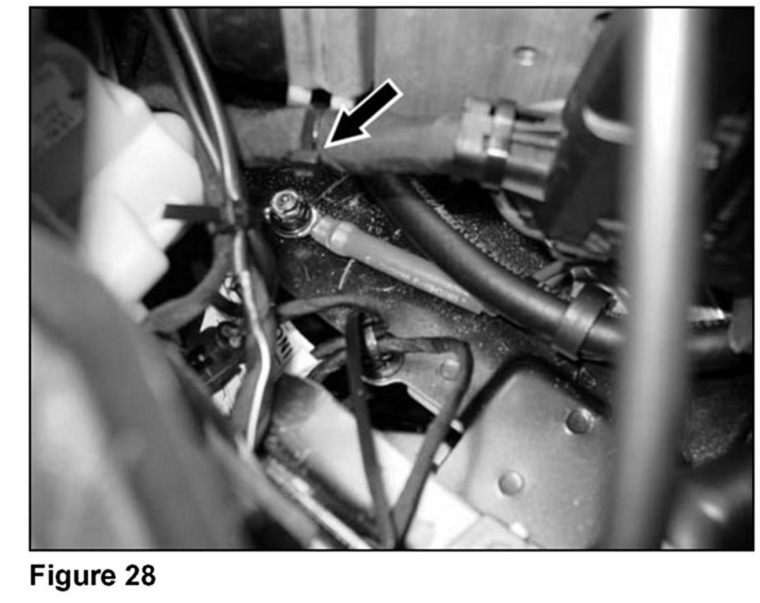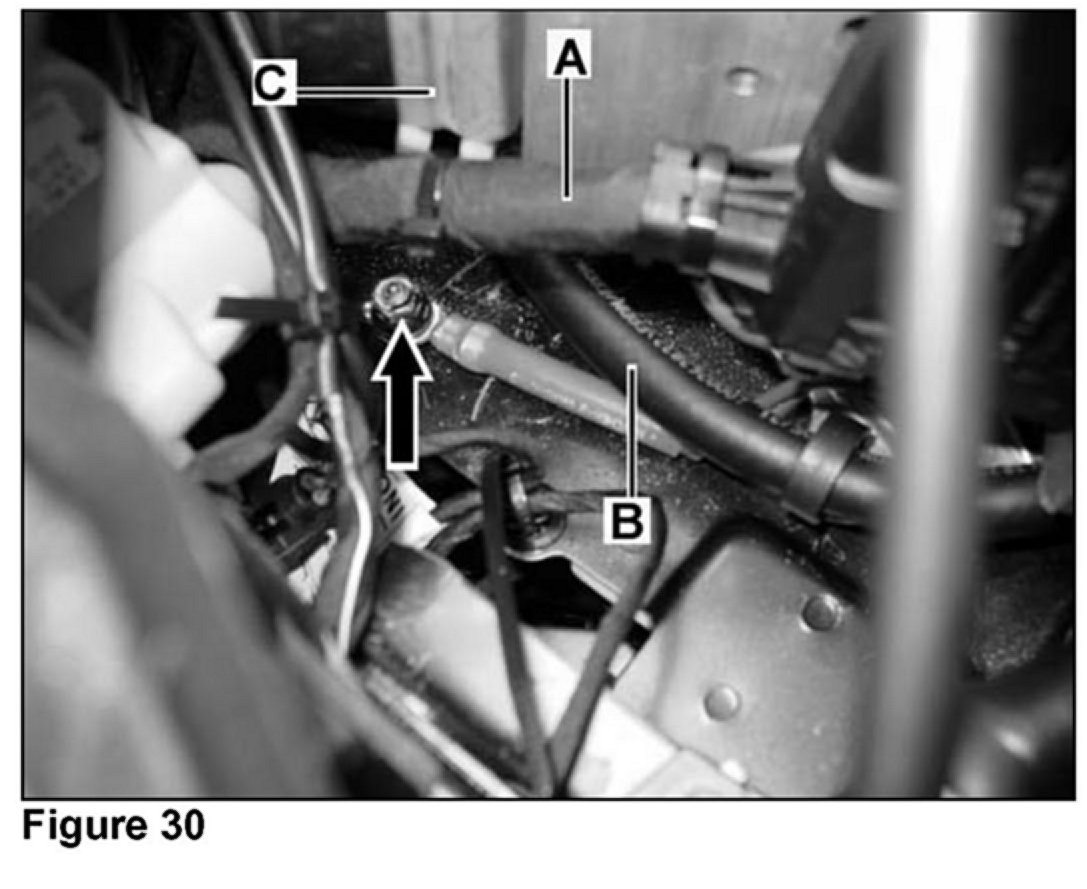 ^ Ensure wiring harness (A, Figure 30) touches the bracket (C, Figure 28) and is mounted there tension free.