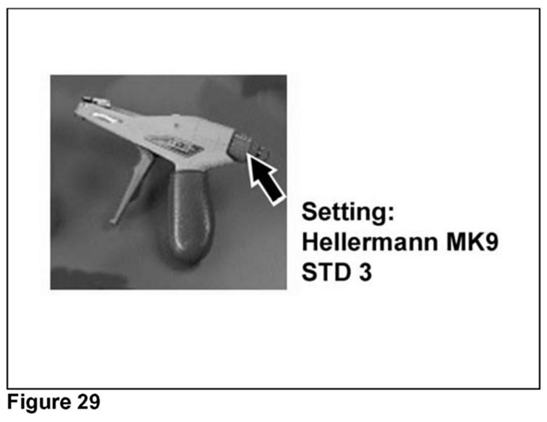 ^ Ensure cable tie (arrow, Figure 28) was properly affixed using cable tie pliers (Hellermann MK9; special tool number W 352 589 02 37 00); use setting 3 on cable tie pliers, as shown in Figure 29.