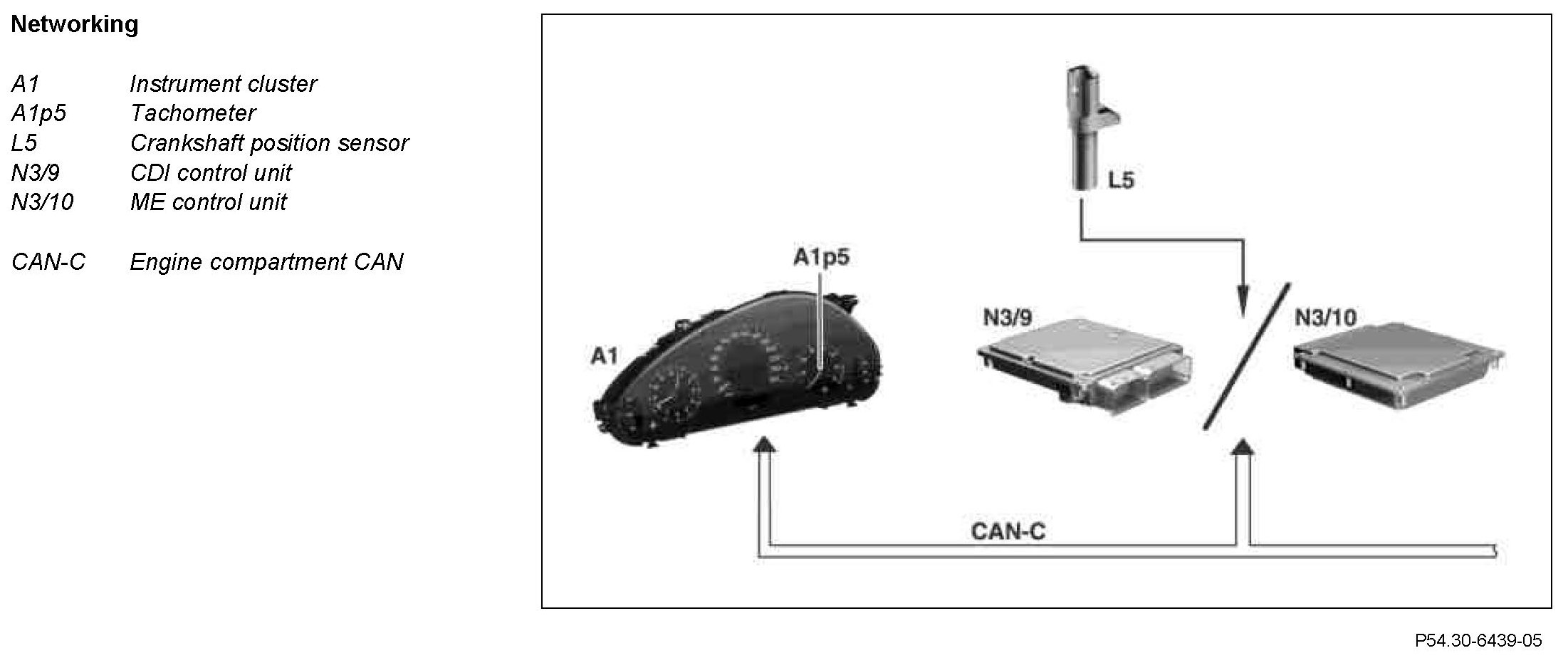The signals from the crankshaft position sensor (L5) are picked up by the ME control unit (N3/10) or the CDI control unit (N3/9) and are transmitted to the engine compartment CAN as a CAN message (in rpm).